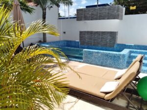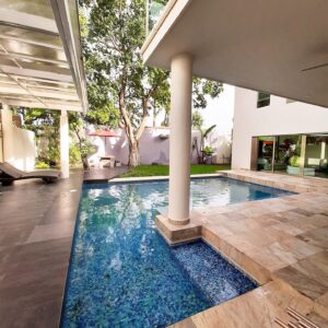 De estacionamiento a patio con alberca y cascada volada